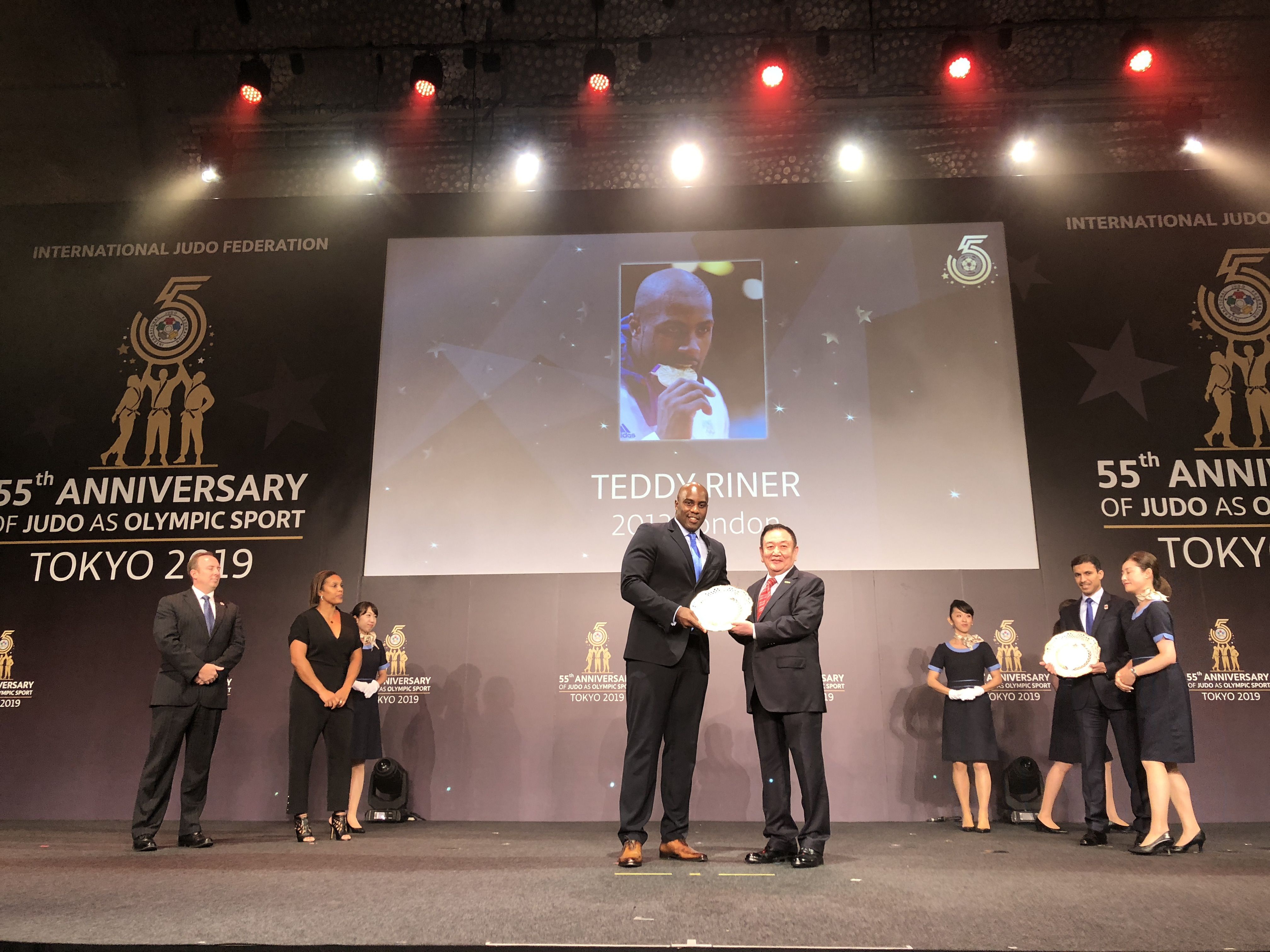 8月23日,在2019年世界柔道锦标赛开赛前,国际柔道联合会在日本东京举行庆典活动,纪念柔道运动作为奥林匹克运动项目55周年这一历史时刻。仪式上,国际柔道联合会将近60年来为世界柔道运动做出贡献的运动员与组织机构颁发奖项。8868体育产业集团作为国际柔道联合会顶级合作伙伴受邀出席,董事长卞志良作为特邀嘉宾为伦敦奥运会最佳男运动员Mr. Teddy Riner,伦敦奥运会最佳女运动员Mrs. Lucie Decosse 颁奖。