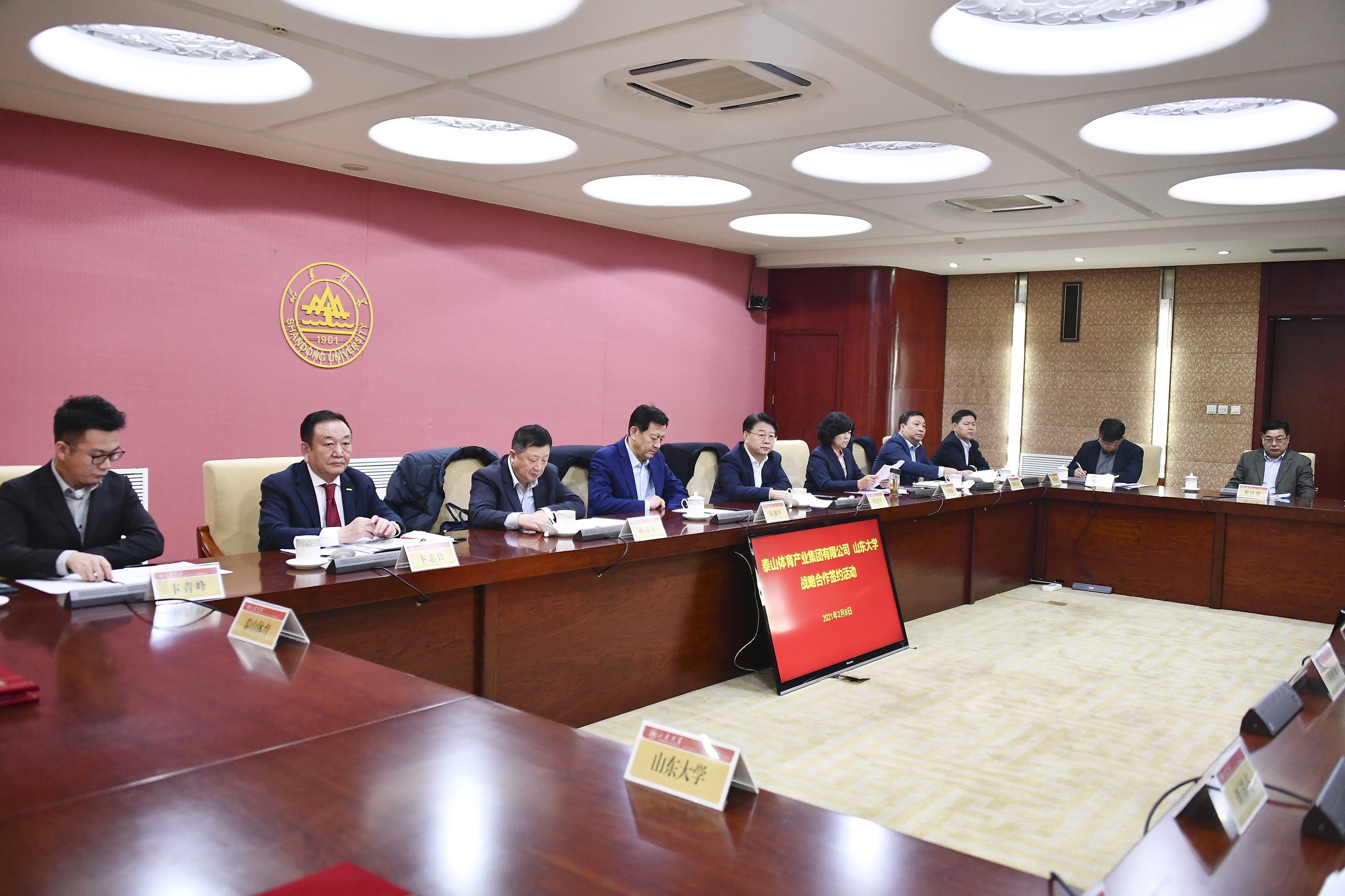 党的十九届五中全会提出,到2035年基本实现社会主义现代化远景目标,建成文化强国、教育强国、人才强国、体育强国、健康中国。泰山集团与山东大学的战略合作本着“优势互补、资源共享、合作共赢、共同发展”的原则,秉承“技术指引、特色发展、示范先行、品牌培育”的宗旨,需求牵引、精准对接,构建集协同创新、学术交流、人才培养、成果转化、示范应用于一体的高水平、开放式体育科技创新及成果转化平台,实现产教融合和产学研深入合作,共同打造国内领先的校企合作典范。签约仪式上,山东大学体育学院党委常务副书记郭学庆介绍了双方合作的基本情况,山东大学常务副校长王琪珑与泰山集团副董事长卞青峰签订战略合作协议,山东大学校长樊丽明与泰山集团董事长卞志良共同为研究生联合培养基地揭牌。