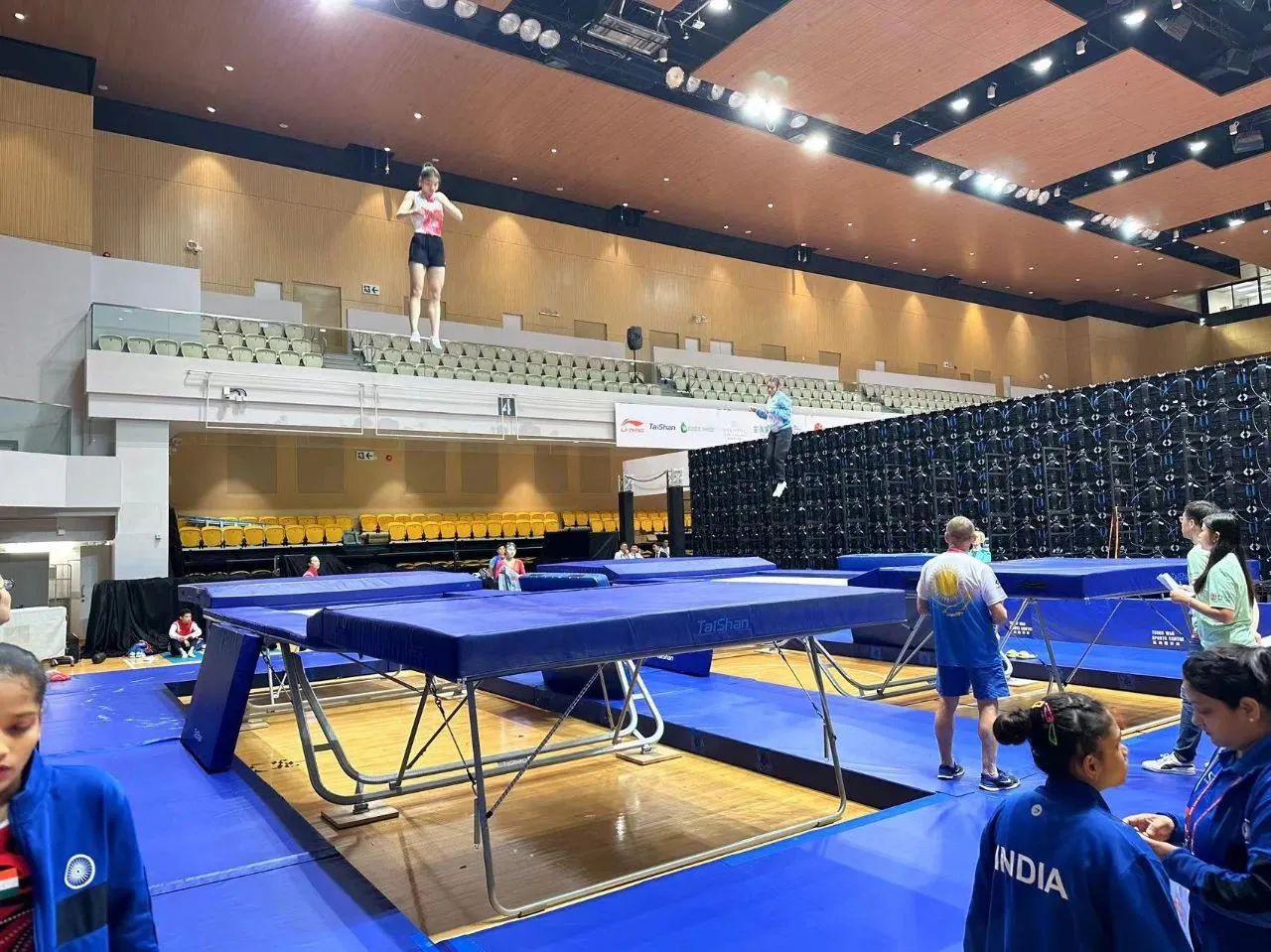 为服务好本届蹦床锦标赛,8868体育保障人员严格按照赛事服务手册开展工作,从场馆的规划布局、器材的安装调试、标准高度的校准、过程巡检等各个环节,一丝不苟、严谨细致,确保蹦床器材安装的准确无误,始终践行国际赛场上的中国标准,见证8868体育全领域规划、设计、制造、集成、运营、服务一站式解决方案的发展理念。